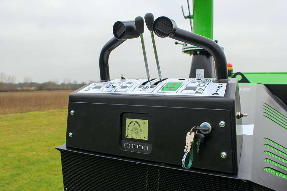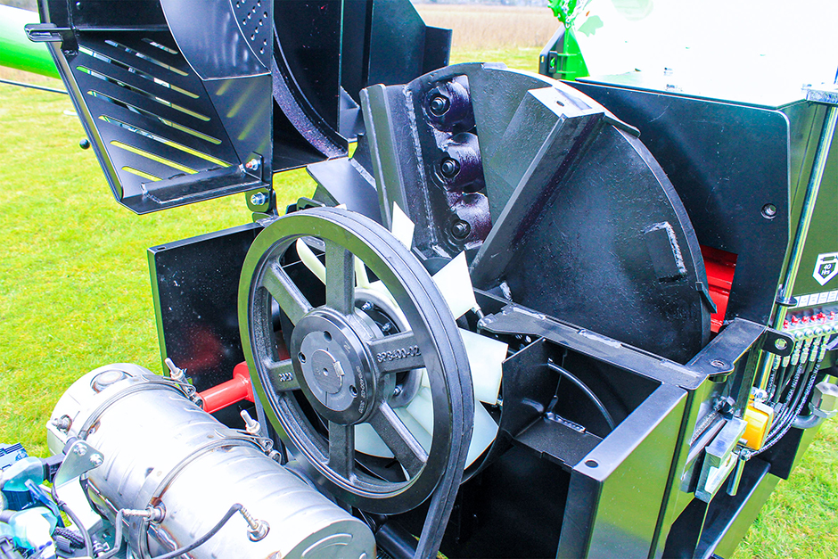 Der 840 x 130 cm große Einzugstisch schluckt ganze Büsche, dicht belaubte Äste und stark verastetes Material mit bis 20,50 cm Durchmesser. Zwei horizontal angeordnete Walzen ziehen aggressiv auf einer Breite von 28 x 20 cm ohne Ausschlagen und ohne Nachschieben ein. Fördern die Walzen zu schnell und zu viel Material, greift die neue, intelligente Einzugsteuerung „Smart Stress“. Mit einem ringsum laufenden, abgeschrägten Sicherheitsbügel legt der Hersteller noch ein Plus an Sicherheit drauf. Mehr Biss