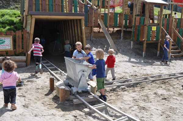 Da sich der Bergwerksspielplatz auf einer Hanglage befindet konnte der untere Bereich perfekt für einen Stollen genutzt werden. Daneben gibt es noch verschiedene Kletterbereiche, lustige Sprechrohre und ein große Röhrenrutsche.