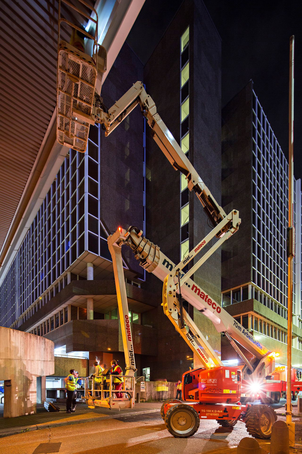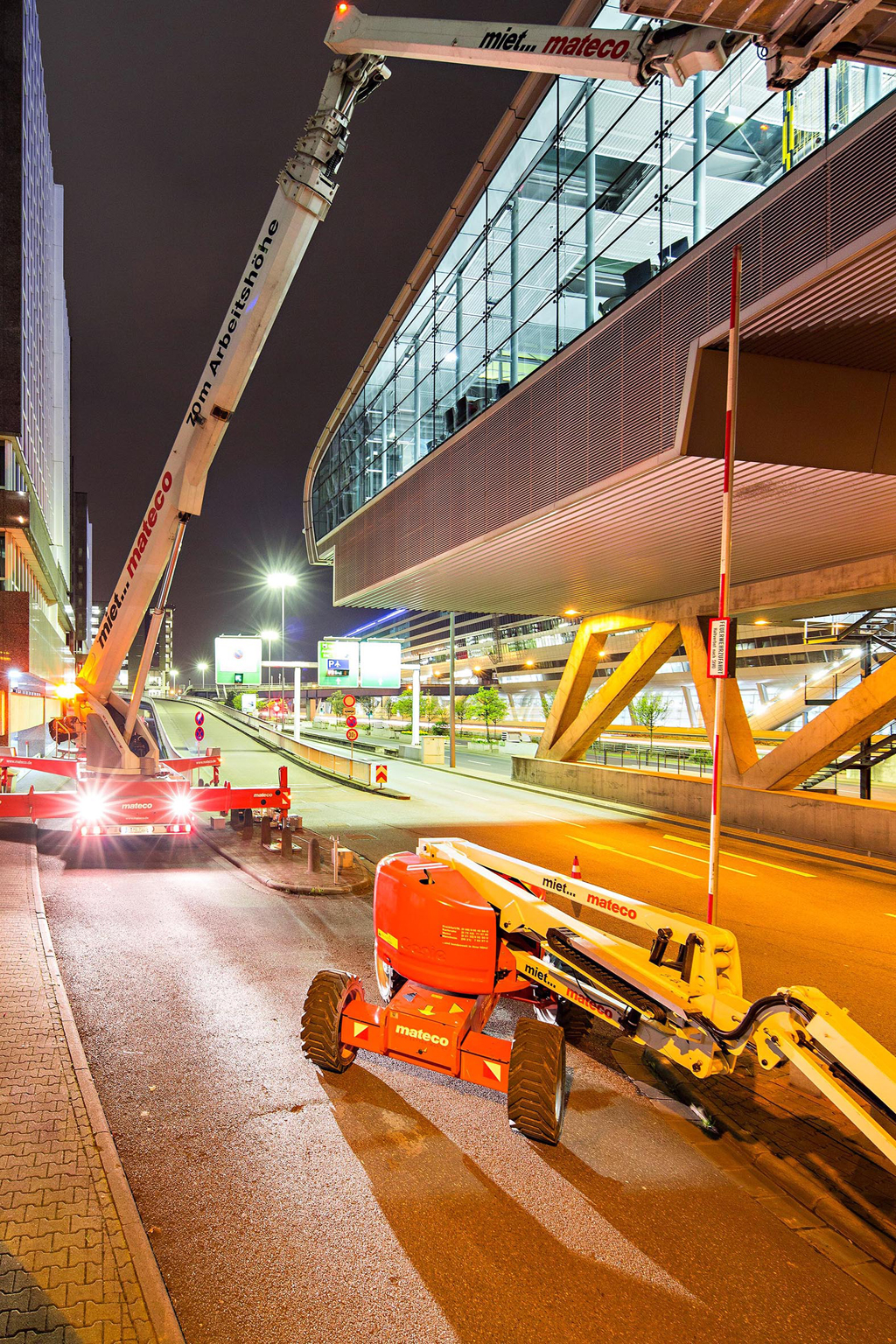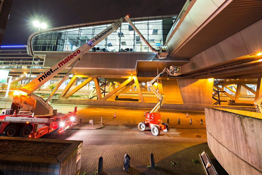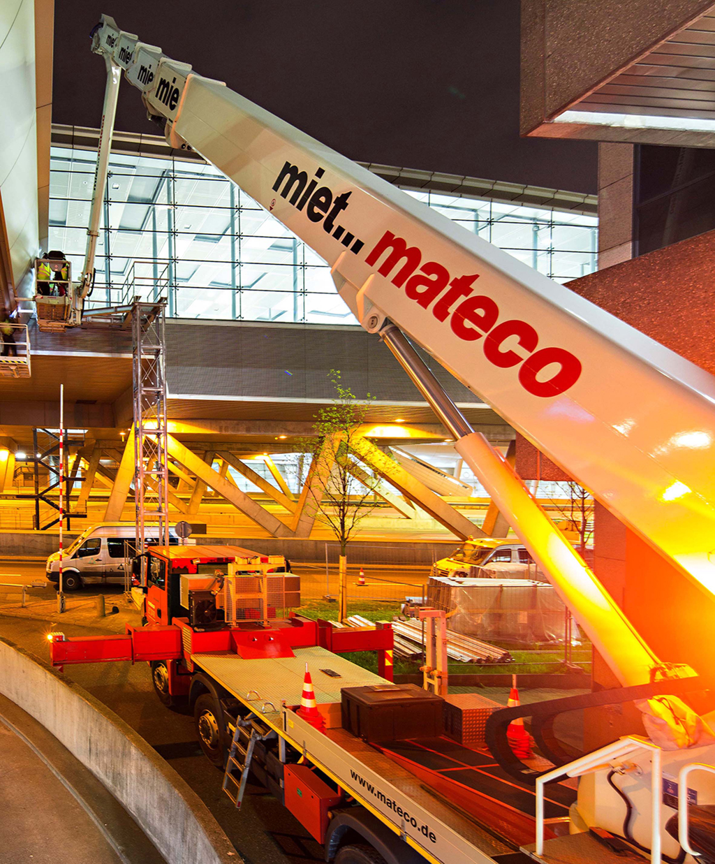 Die Arbeiten erfolgten mit 4 bis 8 mateco-Arbeitsbühnen gleichzeitig. Es kamen dabei sowohl LKW als auch Teleskop-Bühnen zum Einsatz. Mateco war nicht nur durch seinen hoch modernen Fuhrpark der richtige Partner für diesen Einsatz, sondern auch durch den professionellen Service und eine reibungslose Logistik.