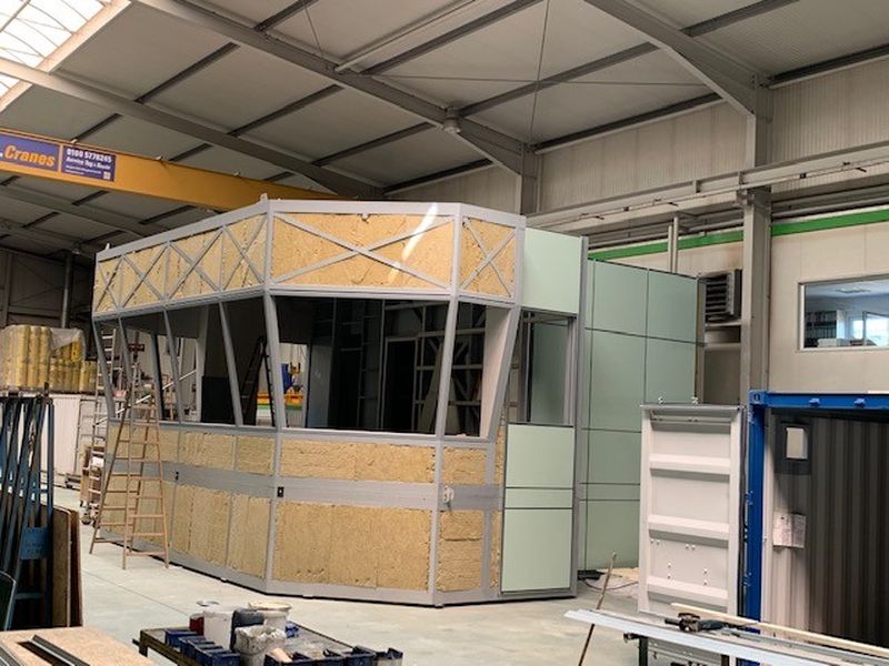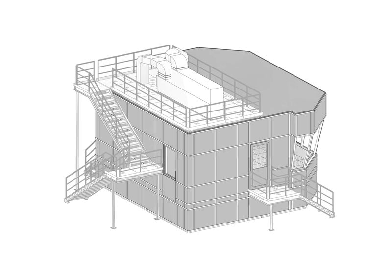 Der Rohboden im Stahlbau ist mit bis zu 500 kg pro Quadratmeter belastbar. Boden-, Decken- und Wandaufbau wurden nach EnEV gefertigt. Das Stahlmodulgebäude verfügt über eine Heizungs- und Lüftungsanlage sowie über eine Teeküche und einen Sanitärbereich. Eine großzügige Fensterfront und mehrere Büroräume bieten optimale Gegebenheiten, um die Abläufe der Produktion perfekt im Auge zu behalten. Insgesamt beträgt die Fläche ca. 75 Quadratmeter.