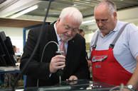 ![]() Ministerpräsident Peter Harry Carstensen in Aktion: Von Hako- Mitarbeiter Klaus Denker (rechts) lässt er sich den Umgang mit einem Ultraschweißgerät erklären und schreitet zur Tat. Fotos (3): Petra Dreu |