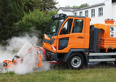 Mit nur 1,32 m Breite und der optionalen Vierrad-Lenkung kann dieser Geräteträger gerade auf engen Straßen oder Wirtschaftswegen hervorragend eingesetzt werden und bewältigt dabei Nutzlasten von bis zu 3,2 Tonnen. Mit bis zu 62 km/h fährt man mit ihm zügig von einem Ort zum anderen und kann somit auch Autobahnen und Kraftfahrstraßen nutzen.