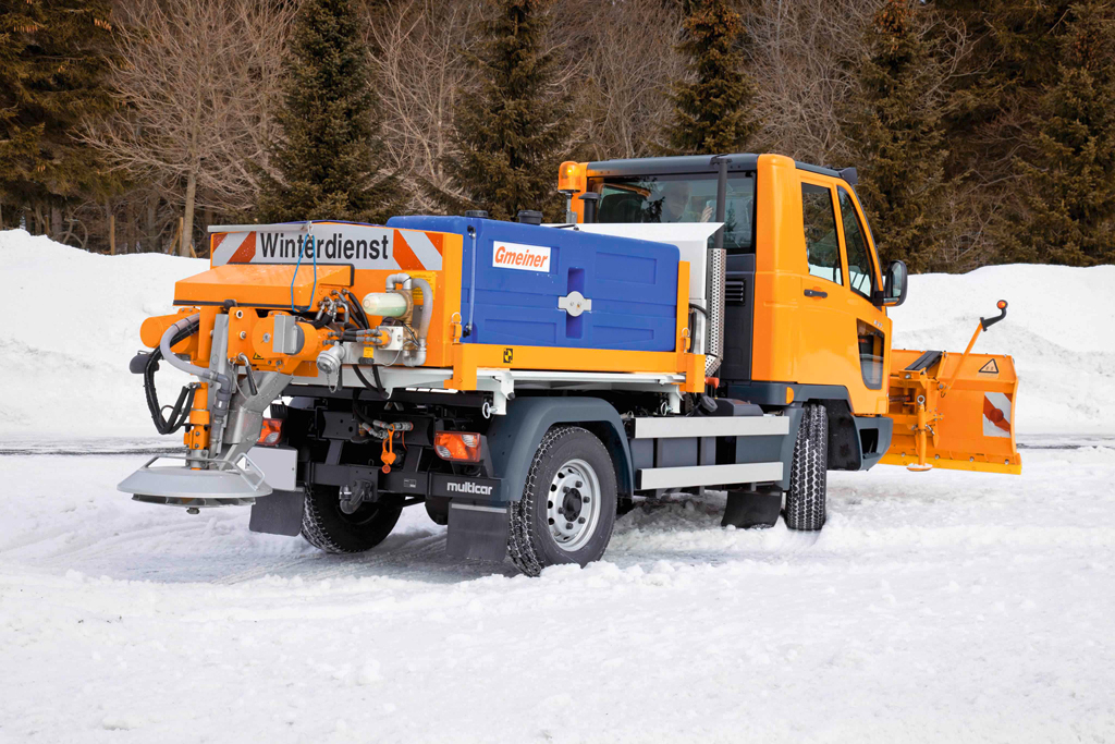 Wer maximale Einsatzflexibilität sucht, findet diese bei den Multicar Geräteträgern und Transportern. Es gibt kaum ein kommunales Einsatzgebiet, das diese Multitalente nicht beherrschen. An drei Anbauräumen lassen sich über 100 am Markt erhältliche An- und Aufbaugeräte einfach anbringen. Allein schon für den professionellen Winterdienst wird hier eine breite Auswahl geboten: von manuellen, halbautomatischen oder voll wegeabhängigen Aufsatzstreuern und Heckanbaustreuern für Salz oder Trockenstoff, bis hin zu Solesprühern. Außerdem Seitenschneepflüge, Keil-Vario-Pflüge, Frontkehrmaschinen und Frässchleudern – um die wichtigsten zu nennen. Die einzelnen Geräte werden durch die leistungsstarken Hydraulikvarianten der Geräteträger angetrieben und lassen sich in der Regel innerhalb kurzer Zeit in Einmannbedienung wechseln.