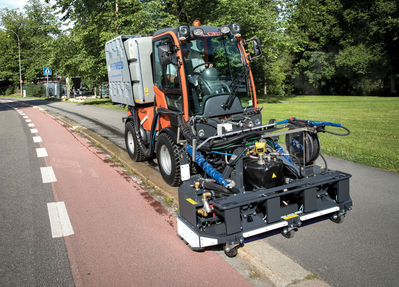Die Heatweed Sensor 400/34 erkennt das Wildkraut mit ihrem Sensor am Frontanbau und versprüht gezielt Heißwasser auf die einzelnen Schadpflanzen. Flächen ohne Wildkrautbesatz werden dabei ausgelassen, wobei mehr als 80% Wasser und 83% Diesel zur Wassererwärmung eingespart werden.