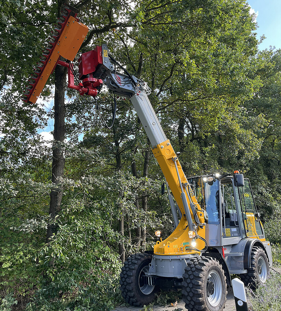 Der robuste Teleskop- und Schwenkarm des Laders ermöglicht auch in beengten Straßensituationen eine stabile Position. Durch die hydraulische Vierpunkt-Schnellwechsel-Einrichtung kann der Lader mit diversen Anbaugeräten ausgestattet werden. Kombiniert mit einer Ast- und Wallheckenschere ermöglicht der TSL 9088 Pro einen präzisen Rückschnitt auch in schwer zugänglichen Bereichen – z.B. über Gehwege, Böschungen und Hindernisse hinweg.
