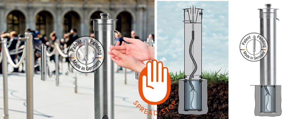 Durch die stabile Konstruktion erfüllt der Spread-Stop gleichzeitig die Funktion eines Pollers, das ist überall dort wichtig wo Personenströme geleitet werden sollen oder ein Anfahrschutz gefordert ist. „Zwei Produkte in Einem“ also – das spart Platz im öffentlichen Raum, und Poller braucht es da sowieso.