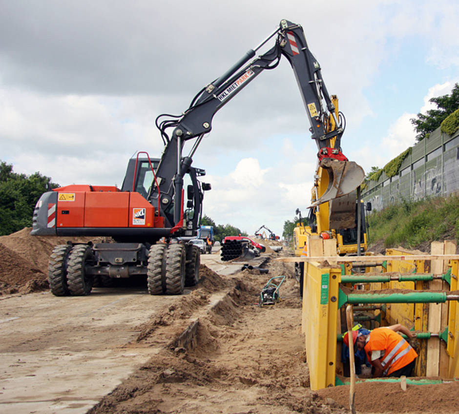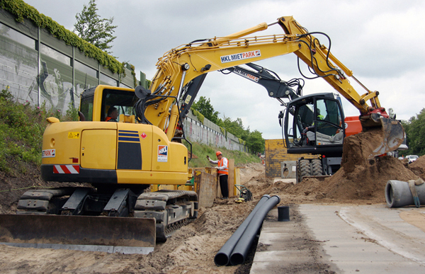 Das HKL Center in Lübeck betreut das Projekt von Beginn an intensiv und versorgt die Großbaustelle permanent mit Maschinen, Geräten und Containern aus dem HKL MIETPARK. Die räumliche Nähe zur Baustelle und die kurzen Wege sind dabei ein echter Vorteil. Der Bedarf ist groß und vielschichtig. Mobilbagger und Kettenbagger verschiedener Gewichtsklassen sind bei Erdbewegungsarbeiten im Einsatz. Ausgestattet mit Tief- und Grabenräumlöffel sorgen sie für den effizienten Abtrag des Oberbodens. Zudem verteilen sie die Frostschutzschicht auf der Fahrbahn. Für die neuen Entwässerungsleitungen heben sie Gräben aus und verlegen Schächte und Rohre. Zur Sicherung der Gruben kommt Verbautechnik von HKL zum Einsatz, zur Entwässerung leistungsstarke Tauchpumpen, die optimale Ergebnisse erzielen. Den reibungslosen Materialtransport auf der gesamten Baustelle garantieren zahlreiche Radlader aus dem HKL MIEPTARK. Für Verdichtungsaufgaben sind mehrere Walzen, Walzenzüge und Rüttelplatten zuständig. Die Unterbringung von Mann und Gerät sichern geräumige Containersysteme von HKL. Darüber hinaus kommen Rohrgreifer, Stromerzeuger, Stampfer, Kanalbaulaser und Pritschenwagen zum Einsatz.
