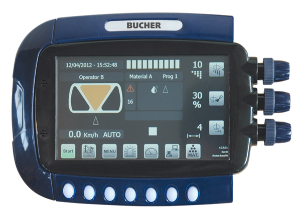 Bei der Steuerung der Streuautomaten können Kunden unter zwei verschiedenen Bedienpult-Varianten wählen. Serienmäßig an Bord befindet sich die Easycom, die bereits über eine geschwindigkeitsabhängige Regelung verfügt. Über eine Displayanzeige lassen sich alle relevanten Daten genau überblicken. Nach oben hin rundet das Ecosat-Bedienpult das Angebot der Steuerungen ab und beweist, wie modernste Elektronik den Winterdienst effektiver und sicherer gestalten kann. Auf ihrem entspiegelten 7-Zoll-Grafikdisplay mit gestochen scharfer Abbildungsqualität erkennen Anwender schnell und sicher alle angezeigten Parameter. Die Drehknöpfe ermöglichen eine einfache und ergonomische Bedienung. Mit der exakten Rasterschaltung können die Parameter schnell und sicher verstellt werden. Mittels USB-Stick oder SD-Karte können die Arbeitsdaten einfach und bequem gespeichert und weiterverarbeitet werden. Auf Wunsch wird die Ecosat durch das Streudaten-Erfassungssystem RouteInform sowie das automatische Streusystem RouteReplay ergänzt.