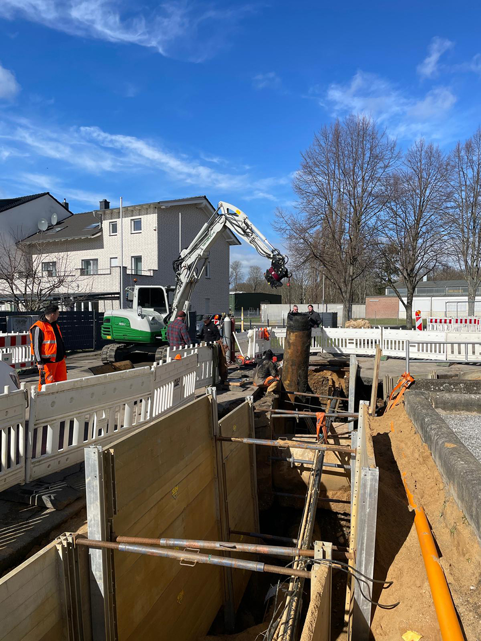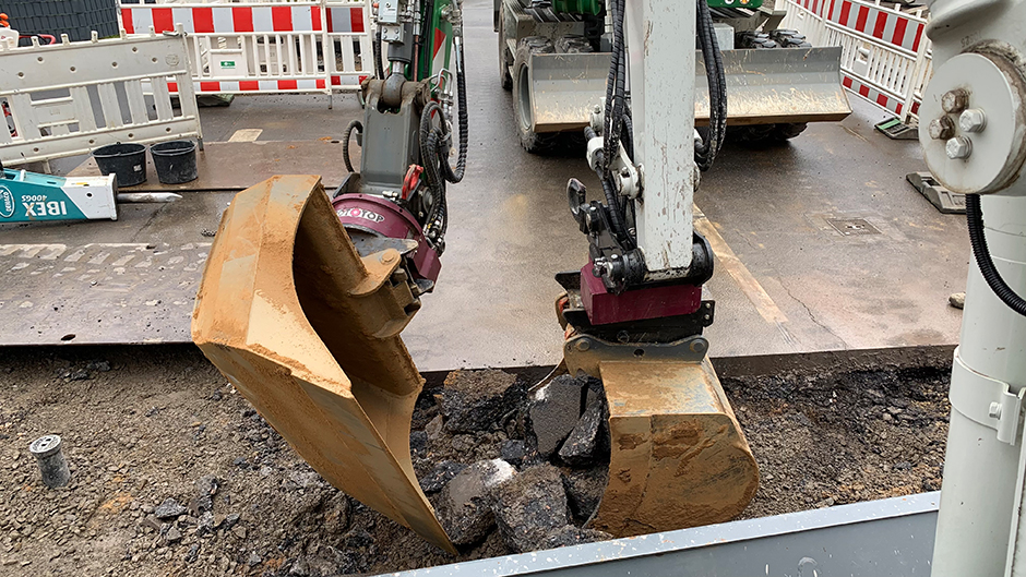 Aktuelles Beispiel ist das Verlegen einer Gasleitung in der Paradiesstraße in Düren im Auftrag des städtischen Unternehmens Leitungspartner. Die Versorgungsleitung mit einem Durchmesser von 560 mm, die in zwei Metern Tiefe verlegt war, musste erneuert werden. Herausforderung hierbei war, die vielen in geringerer Tiefe verlegten Leitungen für Wasser, Strom und Daten bei allen Arbeiten zu umgehen und nicht zu berühren. Hier arbeitete die Kolonne von Lück und Wahlen zunächst mit ihrem Saugbagger, dann kam der Bagger mit dem RotoTop zu Einsatz: Da die Schaufel über Endlosdrehbarkeit und damit maximale Bewegungsfreiheit verfügte, war es möglich, das Material unter den anderen Leitungen hervorzuarbeiten und über einen angelegten Spalt sicher aus der Baugrube herauszuschaffen.