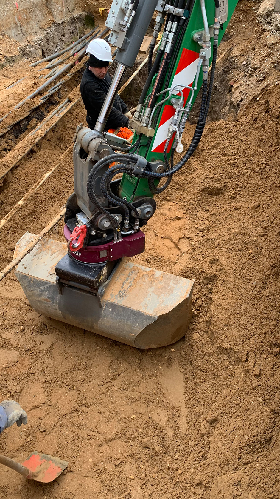 Mittlerweile ist jeder Bagger im Unternehmen mit einem RotoTop ausgestattet, was für eine wichtige und dauerhafte Leistungssteigerung bei der täglichen Arbeit sorgt, wie Klefisch erklärt: „Mit dem RotoTop ist man flexibler und kann sich durch die große Bewegungsfreiheit beim Verfüllen oder Ausschachten den Gegebenheiten viel besser anpassen. Dadurch sparen wir deutlich an Zeit und Handarbeit. So kann ich beispielsweise mit dem Bagger bis ganz an die Gebäudekanten hin verfüllen, weil ich mit dem RotoTop die Schaufel endlos drehen kann und so nirgends anstoße.“ Die Möglichkeit, deutlich filigraner mit dem Bagger zu arbeiten, ersetzt demnach die meiste Handarbeit. Ebenso könne man seitlich an Leitungen heran, ohne ständig den Bagger versetzen zu müssen. Beim RotoTop seien bisher keinerlei Probleme aufgetreten, dieser habe seine Aufgabe immer erfüllt – ganz gleich, ob der Untergrund aus Kies, Sand oder Fels bestand.
