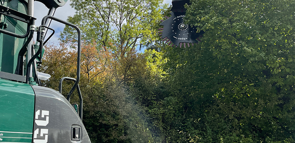 Holp bringt Effizienz in die Landschaftspflege: Das neue Bagger-Anbaugerät CutWheel sorgt dafür, dass Hubsteiger bei der Pflege von Lichtraumprofilen, hohen Hecken und Waldrändern kaum mehr benötigt werden und diese Arbeiten nicht nur schneller und kostengünstiger, sondern auch viel sicherer erledigt werden können.