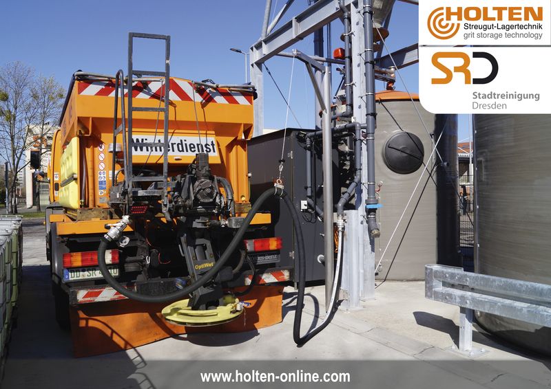 Mit Lkw, Schmalspurfahrzeugen, Kleintransportern und für den Winterdienst umgebauten Kleinkehrmaschinen (Räumschild und Streuer inkl. Soletanksack) wird Sole in den Streutechnologien FS 30 und FS 100, je nach Anwendungsbedarf, ausgebracht. Um dem steigenden Soleverbrauch Rechnung zu tragen, mussten bestehende Kapazitäten erhöht und Anlagentechnik neu beschafft werden, um einen wirtschaftlichen bzw. effizienten Ablauf von Produktion, Lagerung und Verladung der Sole sicherzustellen. Nach einem sorgfältig durchgeführtem Bieterverfahren, inkl. Besichtigungen von Bestandsanlagen, durfte das Unternehmen HOLTEN Anfang November 2019 der Stadtreinigung Dresden ihre neue Soleanlage übergeben.