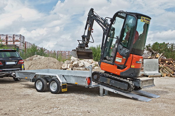 Ein Humbaur Produkthighlight im Bereich Baumaschinentransporter stellt der 3,5 t HS Tandemachser dar. Damit kommen (GaLa-) Baumaschinen immer gut an. Der neue HS ist eine optimierte Weiterentwicklung der bestehenden Serienmodelle und überzeugt mit seiner niedrigen Ladehöhe sowie dem geringen Auffahrwinkel. Die geschweißte Bordwand- und Rahmenkonstruktion aus Stahlblech ist selbstverständlich Tauchbad feuerverzinkt. Der HS ist mit seiner massiven Bauart für tägliche Transporte von leichten und mittelschweren Baumaschinen oder Bagger ausgelegt. Das Gesamtmaß beispielsweise vom Modell HS 353016 beträgt ca. 4960 mm x 2200 mm bei einem Auffahrwinkel von 14 °. Das Gesamtgewicht beträgt ca. 3500 kg bei einer Nutzlast von ca. 2830 kg und einer Ladehöhe von ca. 410 mm. Komplettiert wird der HS mit einer optionalen Baggerschaufelablage sowie den serienmäßig verbauten zwölf montierten Zurrpunkten im Außenrahmen bei einer Kastenlänge von ca. 3000 mm.