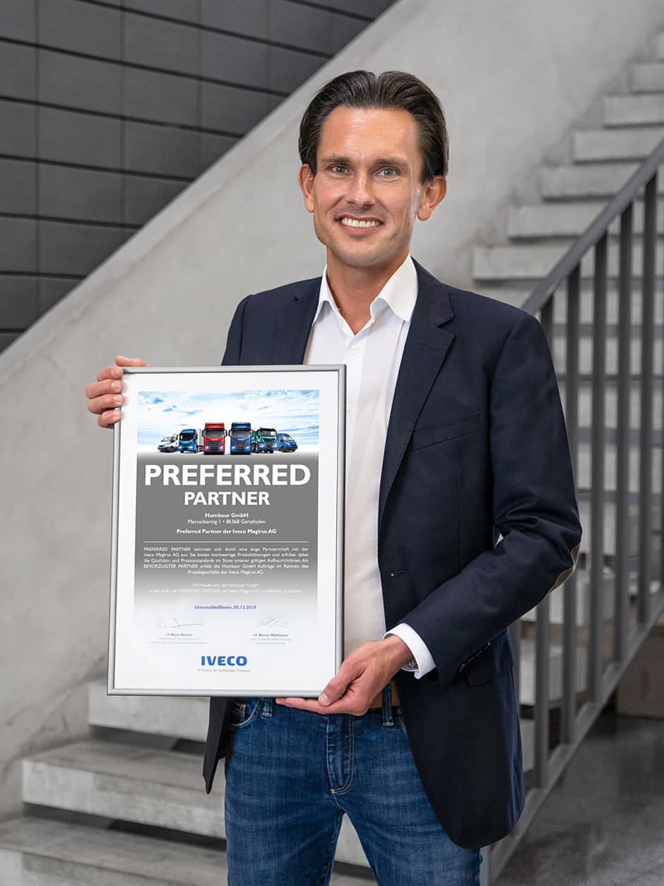 Mit dem Zertifikat „Preferred Partner“ attestiert Iveco dem Unternehmen aus Gersthofen eine enge Partnerschaft. Die von Humbaur entwickelten Produktlösungen sind hochwertig und erfüllen alle Qualitäts- und Prozessstandards im Sinne der gültigen Aufbaurichtlinien von Iveco. Das ist ein weiterer Meilenstein in der langjährigen Zusammenarbeit der beiden Unternehmen. Auch in Zukunft wollen die Humbaur GmbH und die Iveco Magirus AG gemeinsam weitere Projekte angehen. Das Ziel: hochwertige und vor allem effiziente Lösungen für die Kunden.