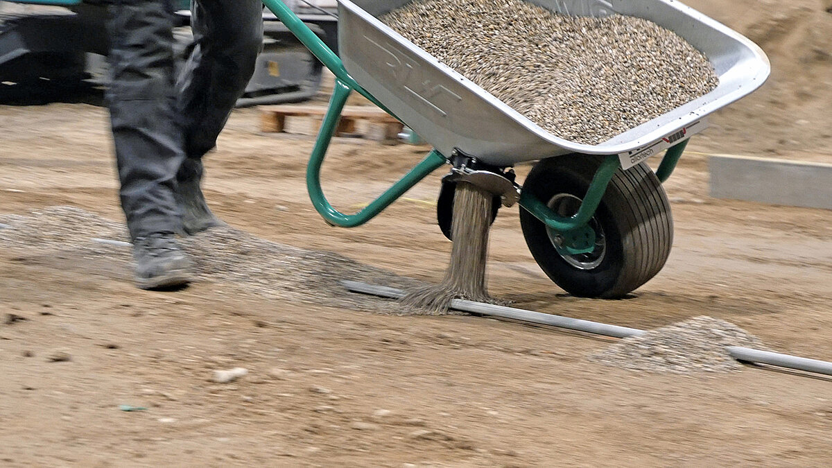 Die Dosier-Schubkarre ist robust gebaut und bietet durchdachte Details: ein elastischer Auslass mit Bowdenzug-Steuerung am Griff, ein höhenverstellbares Rad für eine zwölf cm niedrigere Ladekante als handelsübliche Geräte sowie eine zurückgesetzte Achse für leichtes Kippen. Ein kleiner Breitreifen gewährleistet Stabilität, während der Verzicht auf den vorderen Bügel dafür sorgt, dass die Rohplanie beim Auskippen unbeschädigt bleibt und keine Kieselsteine aufgelockert werden. Lediglich die Bereitschaft, gewohnte Arbeitsweisen zu überdenken, erfordert die Investition in die Dosier-Schubkarre. Wer diesen Schritt geht, profitiert von einem spürbar effizienteren Ablauf und einer deutlichen körperlichen Entlastung der Mitarbeiter.
