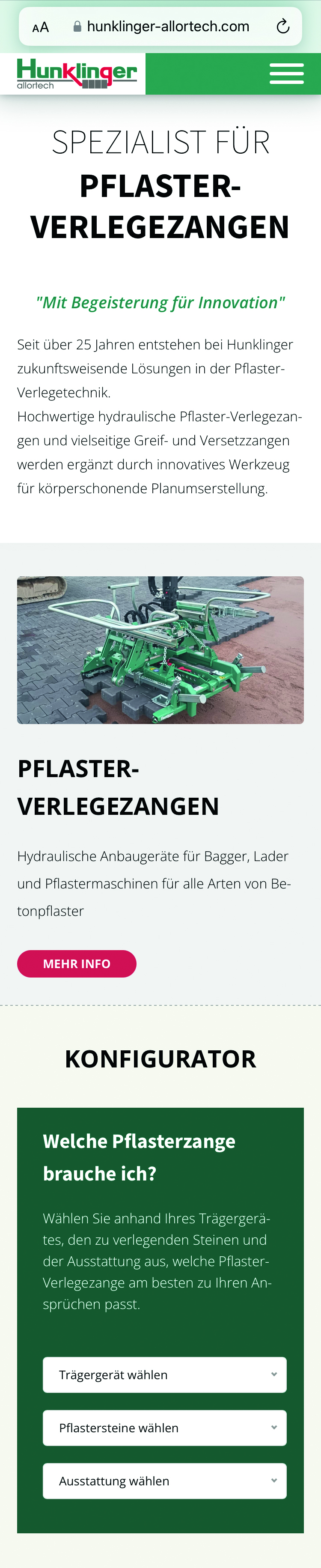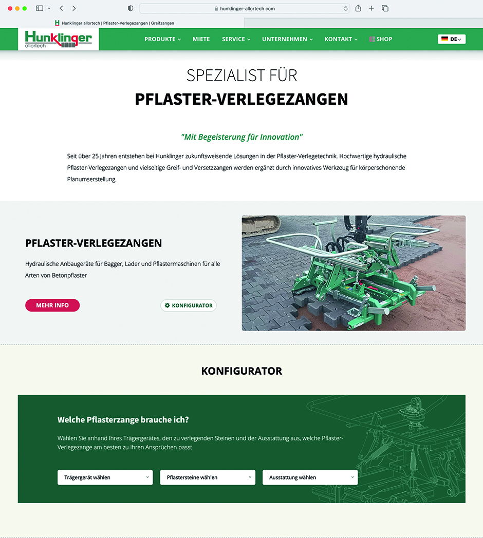 Mit neuem Design und optimierter Benutzeroberfläche präsentiert Hunklinger seine zukunftsweisenden Lösungen in der Pflaster-Verlegetechnik. Ein besonderes Highlight der neuen Website ist der Produkt-Konfigurator für Pflasterzangen: Einfach das Trägergerät, den zu verlegenden Stein und die gewünschte Ausstattungsklasse eingeben und der Konfigurator zeigt, welche Pflasterzange am besten zu den gewählten Ansprüchen passt. Im Anschluss hilft ein Produktvergleich bei der Feinauswahl.