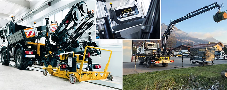 Im Vergleich zum Kipppritschenrahmen wurde die Ladekante um 40 mm abgesenkt, wobei die originalen Kipppunktauflagen erhalten werden konnten. Nur wenige Minuten sind für die Montage bzw. Demontage nötig, und zwar aufgrund der selbstnachspannenden Verriegelung komplett werkzeuglos. Über die Unimog-Hydraulik (Nebenantriebe frei für weitere Anwendungen) wird der HIAB-Kran betrieben. Zusätzlich ist es möglich, selbst bei montiertem Kran einen Anhänger ans Multitalent mit dem Stern anzukoppeln. Idee der Konstrukteure: „Wenn man dem Unimog Arbeitsstunden gibt, dann wird er noch wirtschaftlicher und zum Ganzjahresfahrzeug“, schildert Diplom-Ingenieur Holzki. Diesen „Fächer“ öffne der Kranimog nun noch weiter.