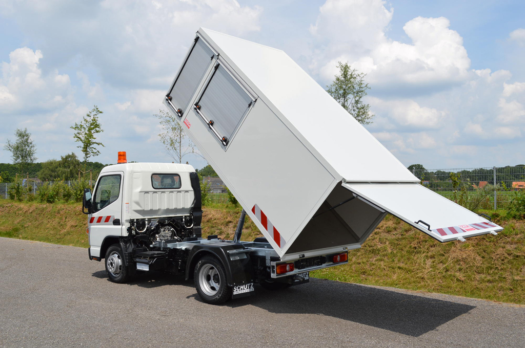 Die abgedichtete Heckklappe lässt sich seitlich über einen Zentralverschluss öffnen. Ein starkes elektrohydraulisches 12 V Aggregat mit Öltank, 5-fach Hydraulikstempel, automatische Endabschaltung lassen den nach CE-Richtlinie gefertigten Aufbau mühelos kippen.