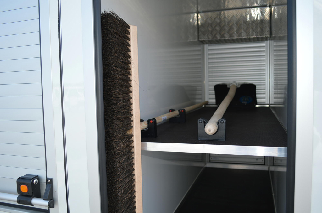 Im separaten Vorderraum können durch dem rechtem Aluminium Rolltor Werkzeuge, Besen und Schaufeln untergebracht werden. Direkt dahinter ist das Einwurf-Rolltor platziert. Als Option können auch beide Rolltore links verbaut werden.