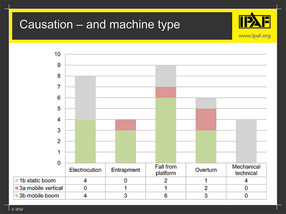 Die Hauptunfallursachen waren: Sturz aus dem Arbeitskorb (9), Stromschlag (8), Umkippen (6), Einklemmen (4) und mechanische/technische Ursachen (4).