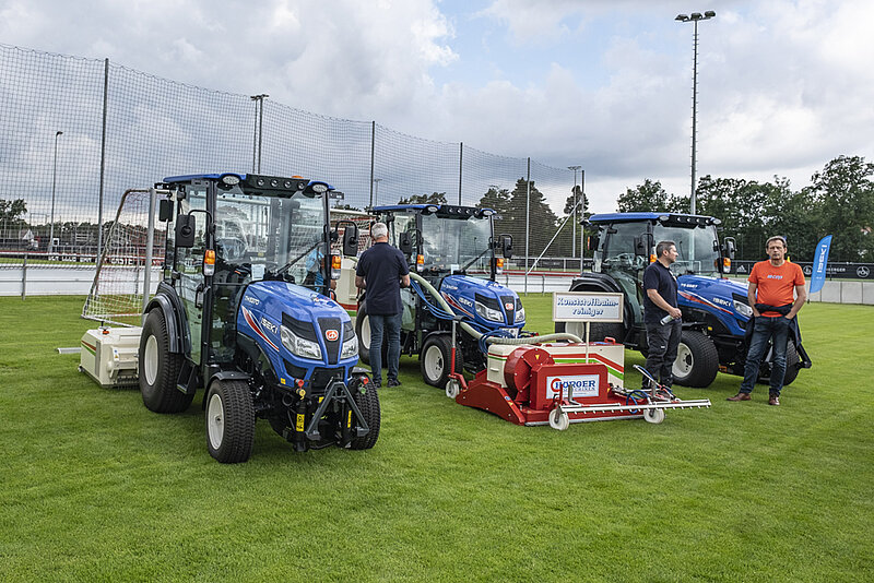 Drei Kompakttraktoren in unterschiedlicher Konfiguration standen parat: ein TH 5370 mit 35 PS und Hydrostat sowie desen kleinerer Bruder TH 5420 mit den Hörger-Anbauegeräten, daneben der TG 6687 mit 66 PS und breiten Rasenreifen.