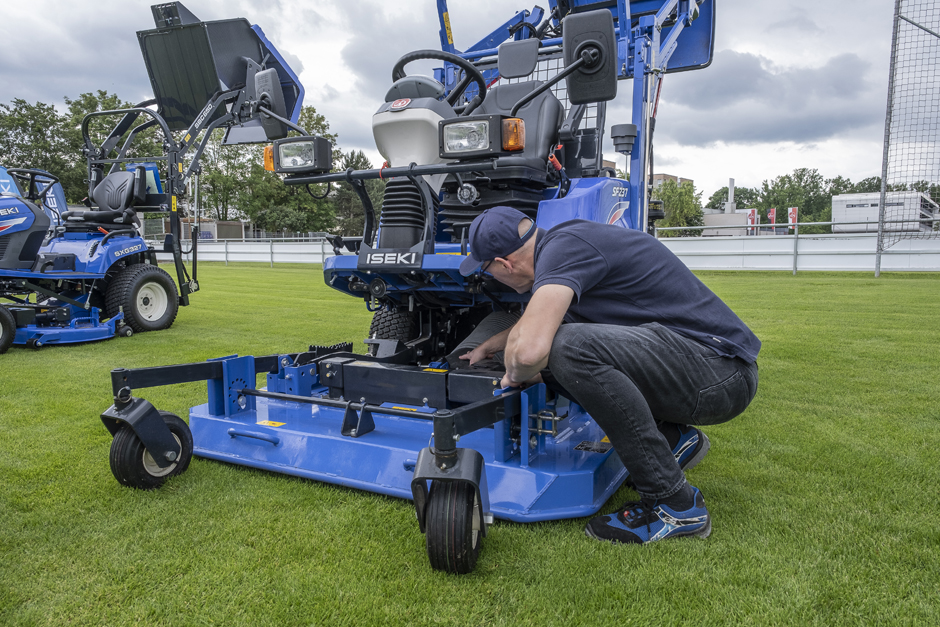 Auf Sportanlagen sind die Einsatzarten für Maschinen oft vielfältiger, als im rein kommunalen Umfeld: „Wenn nur gestriegelt oder gewalzt werden muss, reichen 20 PS aus. Für Mähen oder Aerifizieren sollten es dann aber schon mindestens 35 PS sein, ebenso wenn nebenher noch Kehren oder Winterdienst anfallen“, erklärt Can Gür, bei der Iseki-Maschinen GmbH für Traktoren und Großflächenmäher zuständig. Die Firma ist nicht nur für die namensgebenden Import-Traktoren aus Japan verantwortlich, sondern bietet das Komplettpaket aus dem eigenen Haus an, von der Fronthydraulik bis zum Mähdeck erhält der Kunde alles aus einer Hand. Dabei wird beispielsweise Wert darauf gelegt, dass möglichst viel der Hydraulik fest verrohrt ist, anfällige Schläuch-Systeme vermeiden die Japaner wo es nur geht. Und: Jede bestellte Maschine wird für den Kunden als Einzelstück in Düsseldorf konfiguriert.