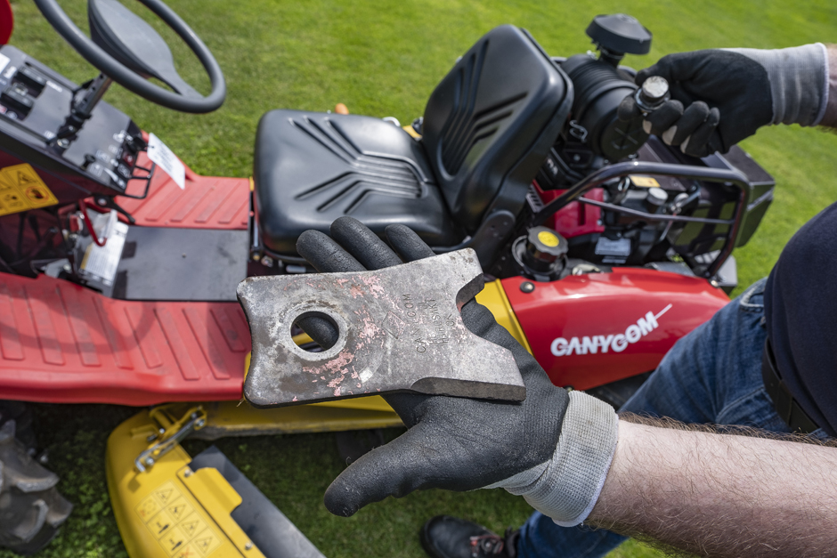 Vorteil des 22 PS leistenden Hochgrasmähers des ebenfalls japanischen Herstellers Canycom ist dagegen die sehr einfache und robuste Technik, wie etwa schnell und werkzeuglos zu wechselnde Messer. Diese verarbeiten auch kleine Bäume problemlos: „Der vorne angebrachte massive Bumper ist hier keinesfalls schicke Deko, sondern drückt alles um, was ihm entgegen kommt. So geben wir auch die Leistungsgrenze des knapp einen Meter breit arbeitenden Mähwerks an: Was der Canycom umdrücken kann, bekommt er auch zerkleinert“, so der zuständige Iseki-Experte Peter Böhm.