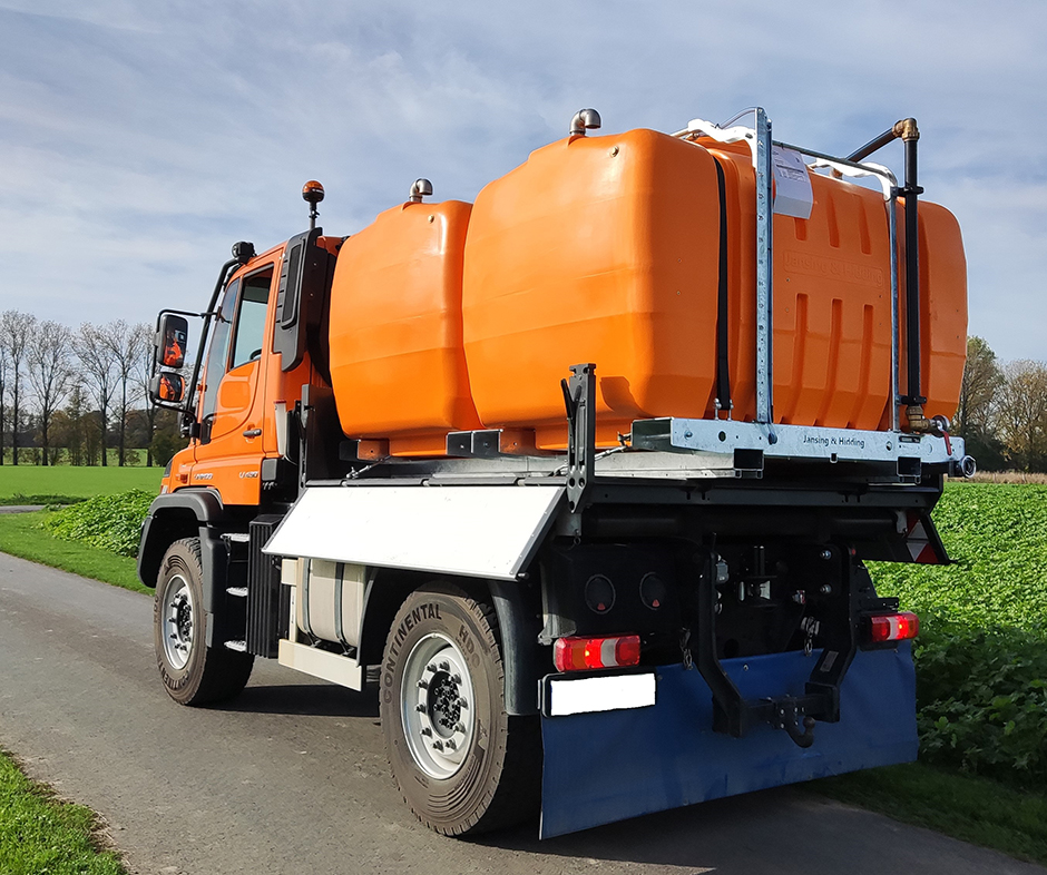 Rechtzeitig zur neuen Saison hat Jansing & Hidding, der Spezialist für Profi-Bewässerungstechnik, die Produktpalette erweitert und ausgebaut. Neben den bewährten Bewässerungs-Anhängern mit 134 cm Außenbreite für Kompakttraktoren, Kompakt-Mobiltanks mit Staplergestell für den Anhänger- und Pritscheneinsatz sowie Dreipunkttanks für Traktoren ab 100 PS, liefert der Hersteller auch Doppel-Tanklösungen und mehr für Pritschen unterschiedlichster Größen (siehe Bild) oder Abrollcontainer an. Einzelne Tanks sind mit einem Volumen von 2.200 oder 2.700 Liter lieferbar. Bei einem kompakten Maß von 200 x 130 cm lassen sich Transportmöglichkeiten je nach Trägerfahrzeug individuell zusammenstellen.