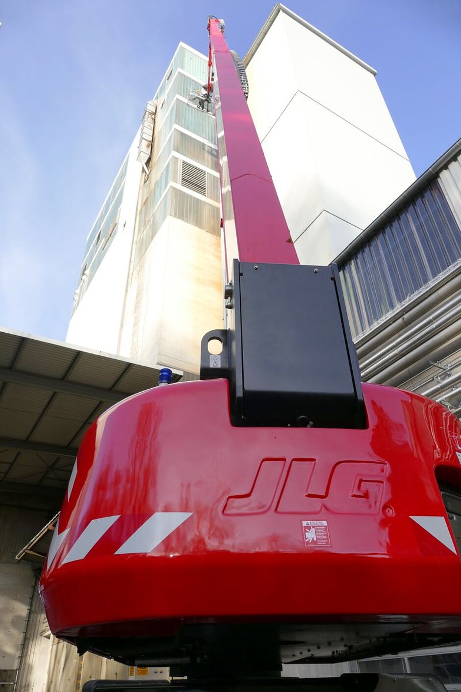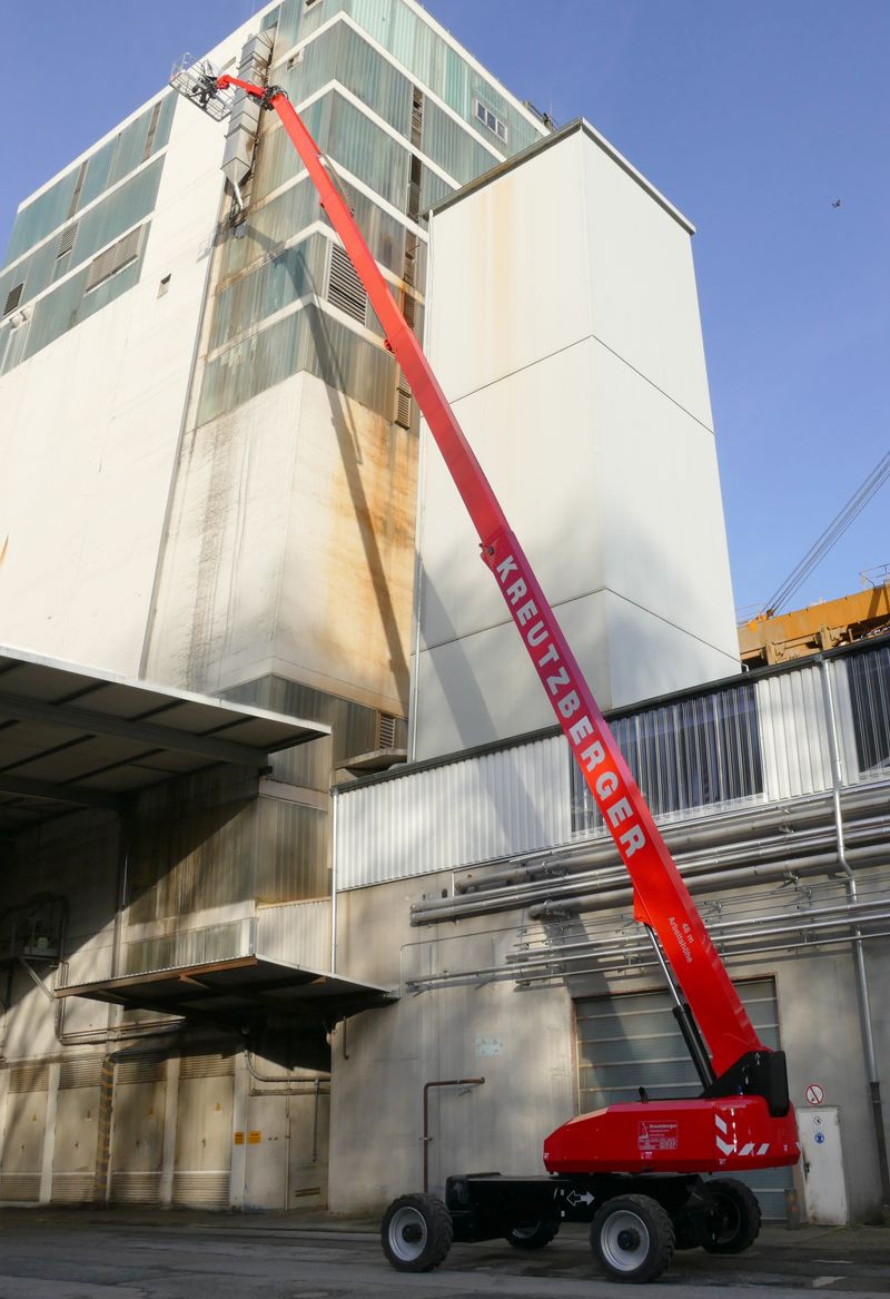 Wenn man der JLG- Teleskoparbeitsbühne 1500SJ bei der Arbeit zusehen will, dann ist der Arbeitskorb in fast 48 m Höhe so weit entfernt, dass man schlicht nicht mehr sehen kann, was die Mitarbeiter in dieser großen Höhe tatsächlich machen. Die 1500SJ gehört zum Mietpark der Kreutzberger GmbH aus Kiel. Sie ist für drei Monate im Kieler Nordhafen im Einsatz. Überprüft wird eine große Silo-Anlage bzw. Ölmühle in der Uferstraße, unmittelbar am Nord-Ostsee-Kanal gelegen. Diese JLG-Teleskopbühne ist aus mehreren Gründen für diese Aufgabe geeignet. Zum einen eben durch die große Arbeitshöhe von 47,72 m, zum anderen aber durch die Beweglichkeit des 7,62 m langen Korbarms am Ende des Teleskopauslegers. Der Korbarm ist vertikal um 120° drehbar (75° nach oben und 45° nach unten). Überdies ist es möglich, in großer Höhe auch über Gebäudeteile hinwegzureichen und diese in Augenschein zu nehmen. Zudem macht es die Tragfähigkeit der Plattform von 230 kg uneingeschränkt und 450 kg eingeschränkt möglich, dass ein oder zwei Personen auf der Plattform sind, und wenn notwendig, genügend Material bzw. Arbeitsgeräte in dieser großen Höhe mitgeführt werden können.
