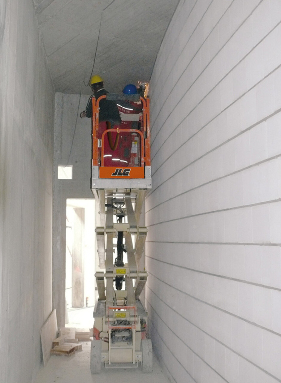 In den engen Katakomben lässt sich die Bühne mit der geringen Chassisbreite von 76 cm und dem minimalen Wenderadius hervorragend verfahren. Rampen kann sie bis 25 Prozent Steigung erklettern und mit 4,4 km/h ist sie zügig unterwegs. Das Absenken oder Anheben der Bühne dauert etwa 30 Sekunden, dies unterstützt die Arbeiter bei ihren vielfältigen Tätigkeiten durch kurze Bewegungszyklen. Das alles sind Werte, die für die Arbeitspraxis ausgesprochen wichtig und von Vorteil sind.