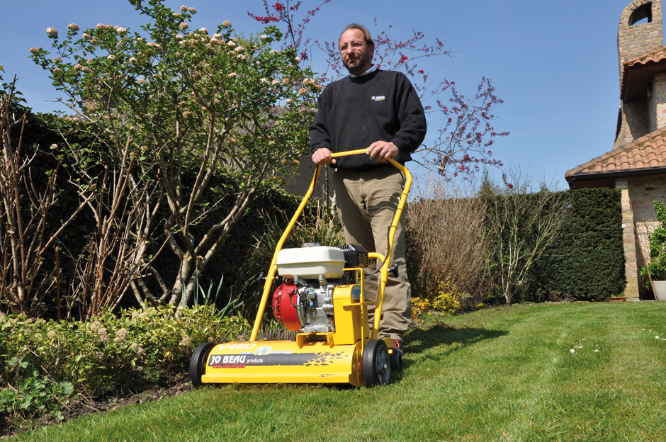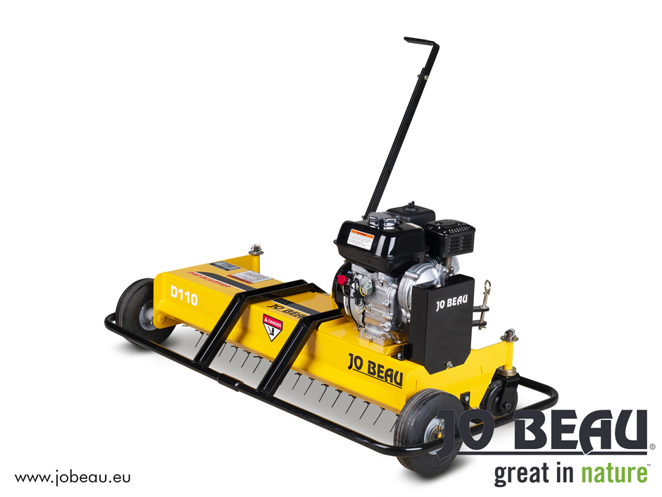Hundert gegenläufige Federzinken auf einer Breite von 965 mm machen den D110 äußerst effizient. Ein Hebegriff aktiviert die federnd gelagerte Zinkenwalze, die auch hier von einem 4,8 PS starken Honda-Motor über eine Kette angetrieben wird. Mit dem Jo Beau D110 lassen sich große Flächen, kommerzielle oder institutionelle Rasenflächen, Golfplätze und Spielfelder schnell bearbeiten.