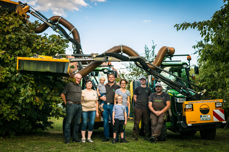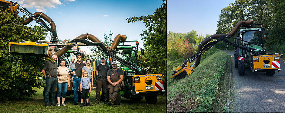 Drei Jahre lieferte die Maschine treue Dienste. Aber, Welz war eine nicht genug. Um dem Arbeitsaufkommen entsprechend nachkommen zu können, und um auf dem neusten Stand der Technik zu sein, hatte er Mitte vergangenen Jahres die Gebrauchtmaschine den Niederländern, die seit etwa drei Jahrzehnten als Generalimporteur für McConnel-Maschinen tätig sind, einfach zurückgegeben. Ende des Jahres kaufte er eine zweite dazu: Zwei baugleiche Heckenprofis mit Absaugvorrichtung und Auffangbehälter an bzw. auf je einem John Deere 4066R stehen nun zum Einsatz bereit. „Mir war wichtig, die neueste Gerätegeneration zu haben – auch was die Ersatzteilthematik betrifft. Außerdem sollten die Kunden nicht sagen können: Ich will die Neue“, erläutert der Vater zweier Söhne. „Ich wollte mit der zweiten Maschine Ausfällen vorbeugen bzw. Spitzen brechen.“ Denn, Jochen Welz hat lieber mehr Kapazität als zu wenig. Immerhin sind zwischenzeitlich im Zeitraum von Mitte Juni bis Ende September zwei Mann hinter den Steuerrädern der Heckenprofis zu nahezu 80 Prozent ausgelastet.