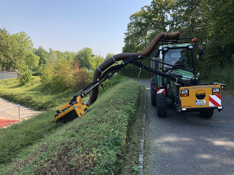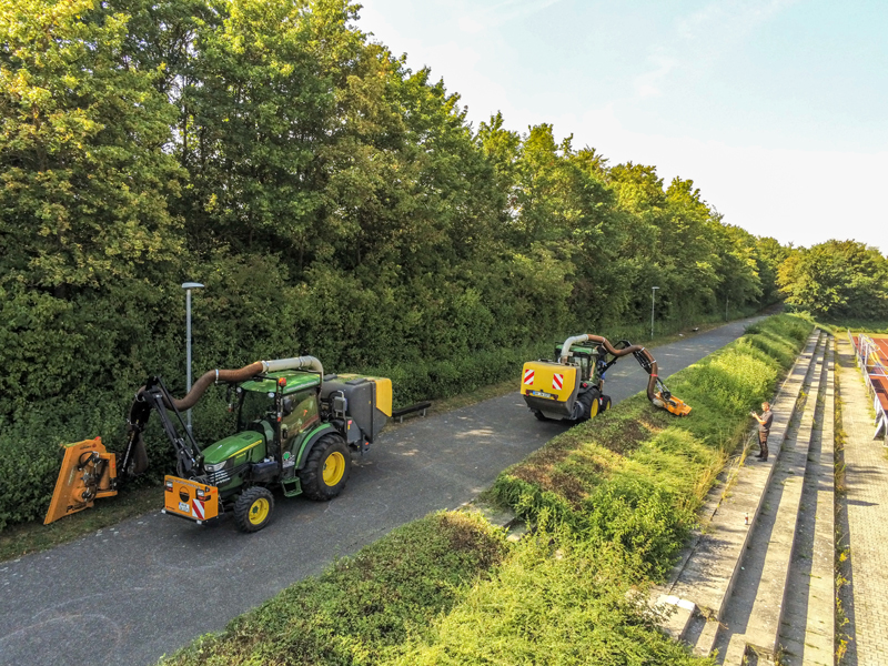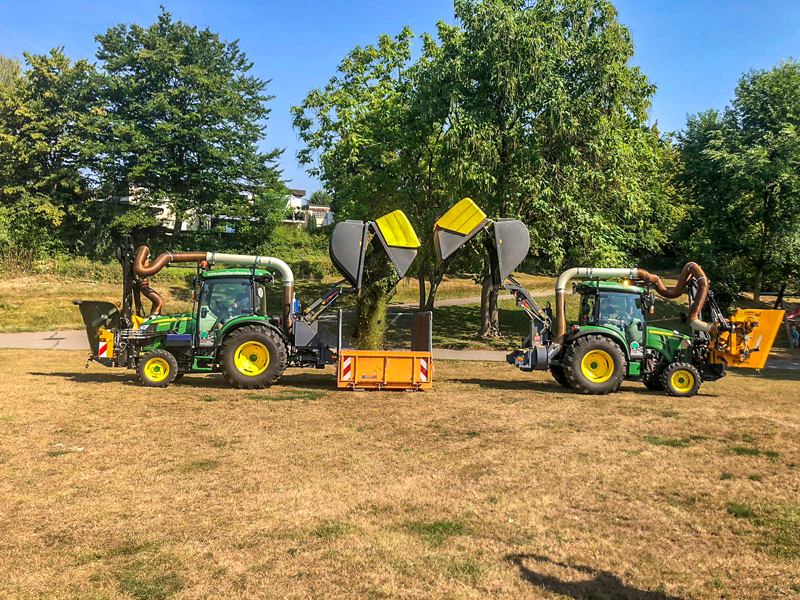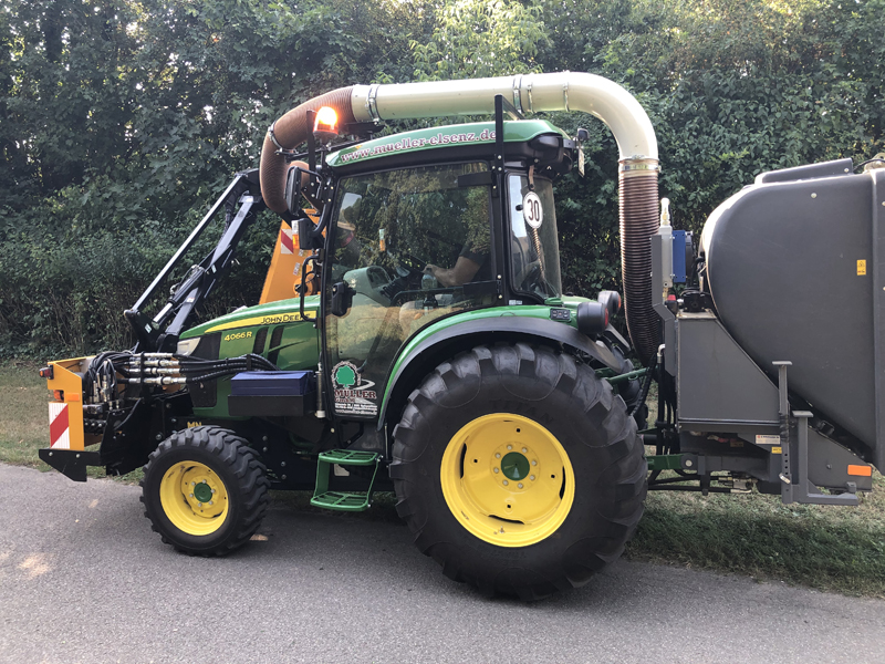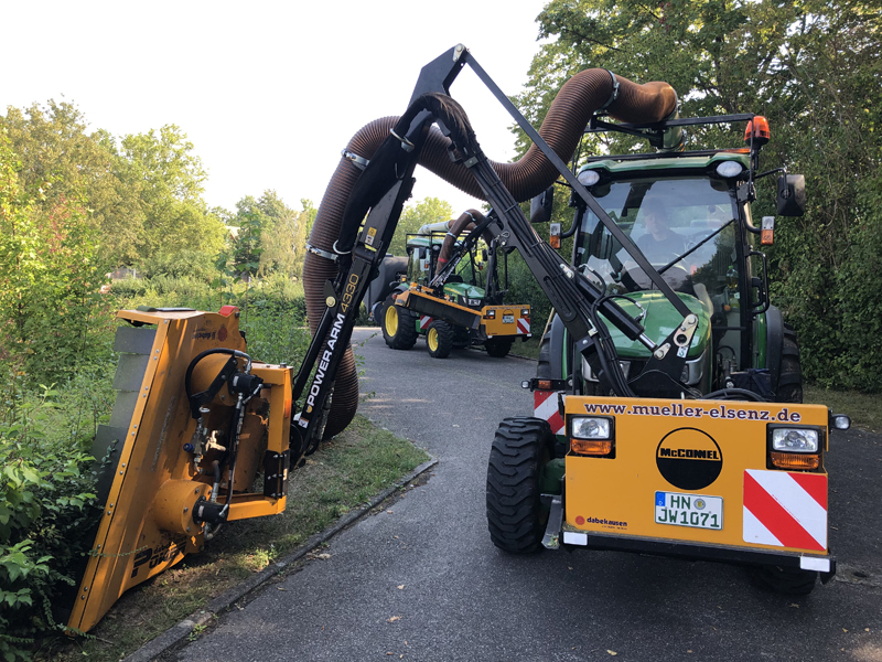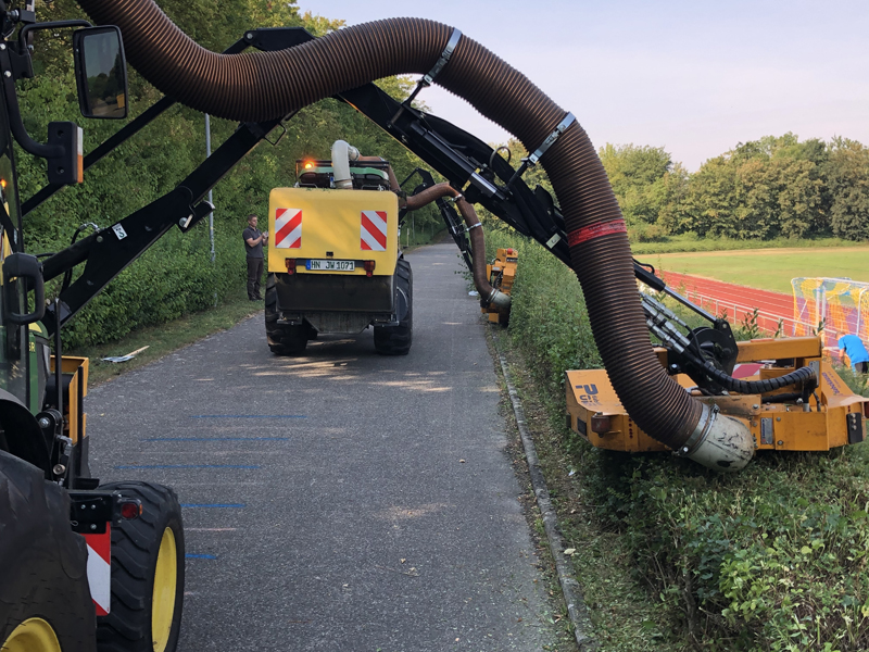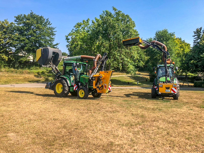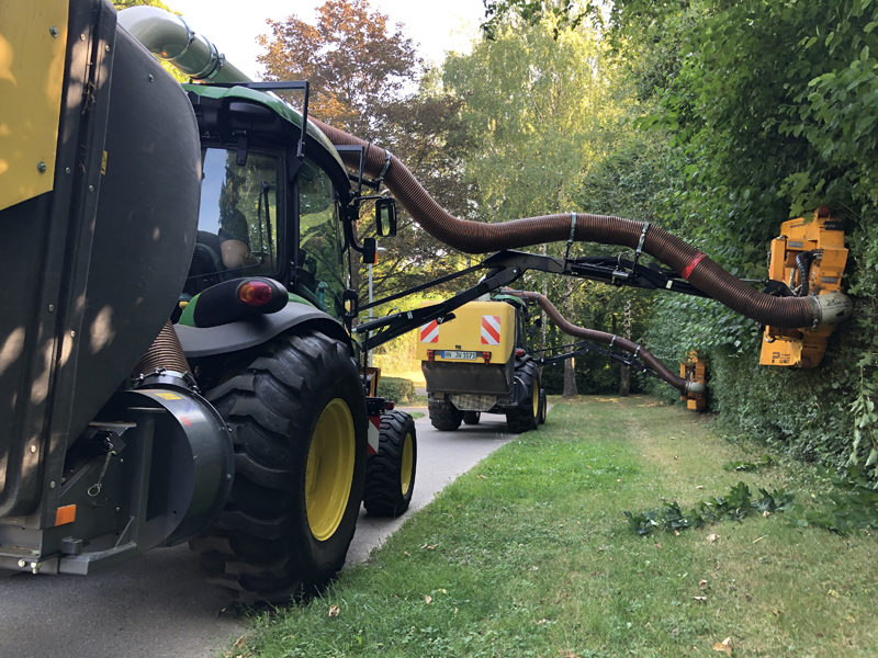 Zwei John Deere Traktoren im typischen Grün rollen um die Ecke. Beide mit Mähauslegern im Frontanbau. Auf dem Buckel tragen die Fahrzeuge große Auffangbehälter, die über mächtige Saugschläuche mit dem Mähkopf verbunden sind. Der Fahrer des ersten Traktors stellt das Schneidwerkzeug hochkant, um der Hecke am Sportplatz den richtigen Schnitt zu verpassen, denn sie ragt bereits einen guten halben Meter in den Fußweg. Im Abstand von wenigen Metern folgt die zweite Mäheinheit – ein exaktes Pendant der ersten – und sorgt mit waagrecht stehendem Mähkopf für die passende Höhe des Gewächses. Alles geht äußerst flugs, immerhin rücken die Fahrer der Müller Forst- & Landschaftspflege GmbH der Hecke mit zwei Heckenprofis von Dabekausen bzw. McConnel auf den Pelz. Durch die Absaugung gelangt das Schnittgut direkt in den Auffangbehälter. Im Gegensatz zur früheren Arbeitstechnik mit dem Doppelmesser entfallen somit die kompletten Aufräumarbeiten des Schnittguts, was eine extreme Zeitersparnis und Arbeitserleichterung bedeuten.