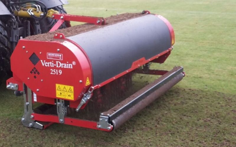 Mit dem Tiefenlockerungsgerät Verti Drain Mustang III können auch Rasenflächen, die keinen normgerechten Bodenaufbau vorweisen, problemlos bearbeitet werden. Die Weiterentwicklung der bewährten Verti-Drain-Mustang-Baureihe arbeitet schneller als das Vorgängermodell und weist damit eine höhere Flächenleistung aus. Trotz eines geringen Gewichts beträgt die maximale Arbeitstiefe 250 mm bei einer Arbeitsbreite von 195 cm.
