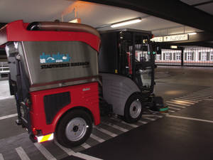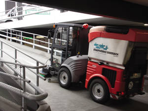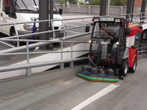 Diese Erfahrungen machten auch die Stadtwerke Biberach, die nach einer teuren Komplettsanierung Abhilfe suchten: Heute kommt in allen städtischen Parkhäusern der Citymaster 1200 CityCleaner zum Einsatz, um Feuchtigkeit und Salzeintrag frühzeitig zu beseitigen. Zusätzlich ausgestattet mit einer Kehreinheit ist das Herz der Maschine das Schrubbdeck. Es sorgt mittels rotierender Bürsten für Geh- und Radwegen, Tiefgaragen und Parkhäusern. Mit einer Arbeitsbreite von 1 330 mm ist die knickgelenkte Maschine sowohl auf großen Flächen wie auch beengten Innenstadtbereichen in ihrem Element. Durch den Allrad-Antrieb bewältigt sie problemlos alle Steigungen und fährt bei Bedarf während des Arbeitsvorganges selbst auf den Rampen aus dem Stand an. Da ihr Bordsteinkanten überhaupt keine Probleme bereiten, kann sie problemlos von Parkhaus zu Parkhaus fahren, damit die entsprechenden Arbeiten durchgeführt werden können.