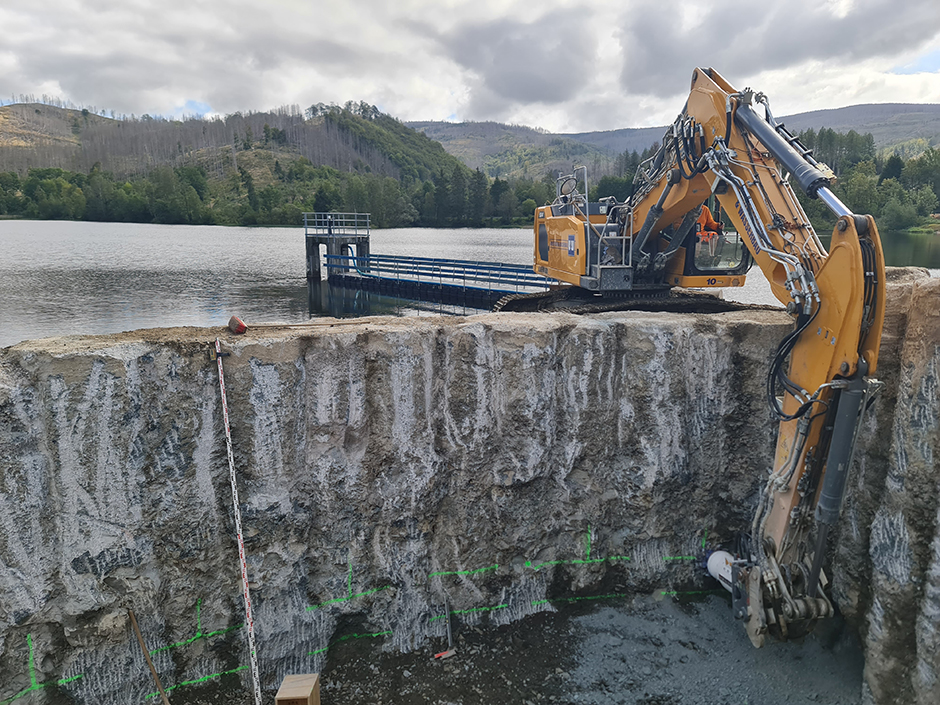 Bei Osterode im Harz wird die Vorsperre der Sösetalsperre saniert. Dabei erhält sie eine neue Dammdichtung in Form einer Bohrpfahlwand. Diese wird im Sohlen- und Kopfbereich mit zwei Gurten aus Stahlbeton versteift. Um in den Bohrpfählen die Vertiefungen zum Eingießen von Stahlbetonspornen herzustellen, verwendet die Umwelttechnik & Wasserbau GmbH (U&W ) einen betriebseigenen 24-Tonnen-Bagger mit einem KEMROC Powertool-Antrieb KRX 70 plus Fräsaufsatz. Damit gelingt das Vorhaben mit notwendiger Präzision und erwarteter Geschwindigkeit.