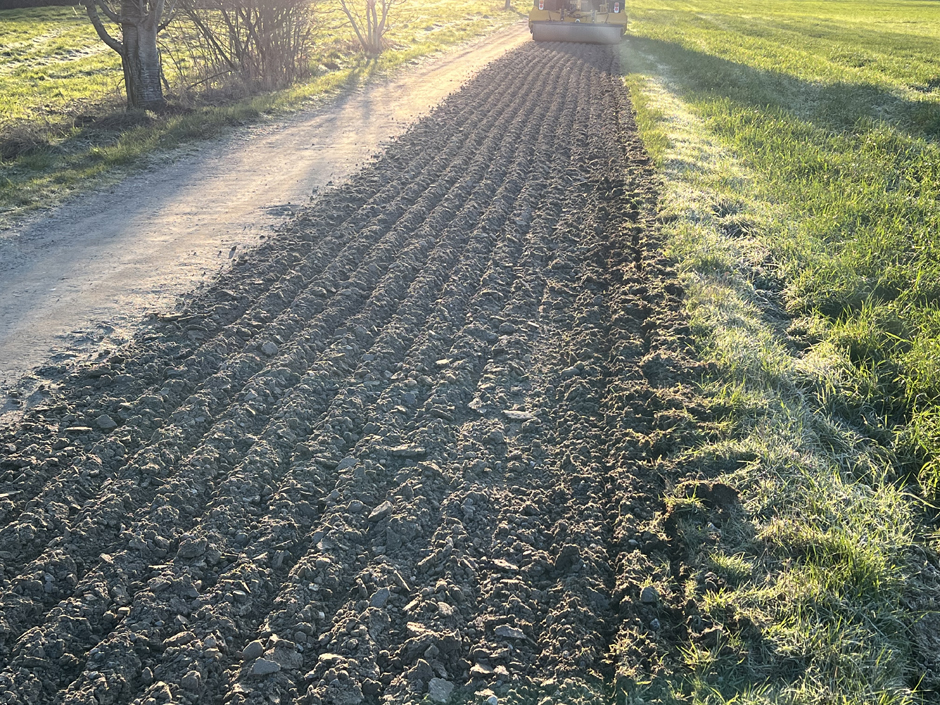 Hier kommt der Maxi zum Einsatz, dessen hydraulisch absenkbare Zähne die Oberfläche des Weges bis zu acht cm tief aufreißen, um eine gleichmäßige Verzahnung von ausgefahrenen Schlaglöchern wiederherzustellen. Durch die Form der Rückwand wird das Material im Hobel vermischt und mittels Verteilerschild vermehrt in die Weg-Mitte gebracht. Somit entsteht ein Dachprofil, das Regen einfach abfließen lässt. Eine sinnvolle Arbeitsweise, wie Werkstattleiter Daniel Klug des Bauhofs Kalkar berichtet: „Mit unserem alten Planierhobel konnten wir Material nur bewegen, nicht mitführen.“ Auch Andreas Thissen, der stellvertretende Betriebsleiter des Bauhofs, sieht in der Funktion eine gelungene Ergänzung: „Man muss bei solchen Aufgaben einfach mit dem vorhandenen Material arbeiten.“