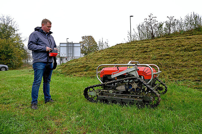 Mit einem dumpfen Brummen wird das Mulchdeck der roten Hycut-Funkraupe angeworfen und sie fräst sich kraftvoll durch das Gras und Gestrüpp des Lärmschutzwalles. Ein besonders dichtes Büschel wird angesteuert, dann verlangsamt sich die Raupe plötzlich. „Das ist die Speed Control, die reduziert die Fahrgeschwindigkeit automatisch, wenn die Grasdichte zu hoch wird“, bemerkt Bernd Bossmann, Geschäftsführer der Kersten Arealmaschinen GmbH. „So sorgen wir dafür, dass die Maschine nicht überlastet wird, und garantieren ein einheitliches Schnittbild.“ Tatsächlich zieht die Raupe schnell wieder an und hinterlässt sauber gemulchtes Gras auf einer Mähbreite von 115 cm. Gute Leistung, doch wie sieht es mit der Reichweite der Funkfernbedienung aus? „Die reicht weiter, als wir hier Platz haben“, räumt Bossmann mit Blick auf die Lagerhalle ein, die das Gelände in circa 150 Metern begrenzt. Insgesamt schafft die Raupe laut Hersteller-Informationen bis zu 300 Meter, in der Wiese und am Hang. Schließlich ist die Hycut ebenfalls für bis zu 55 Grad (142 Prozent) Hangtauglichkeit ausgelegt. Die können auf dem Lärmschutzwall am Rande der Wiese nur in Teilen getestet werden, dafür besteht im Anschluss an die Maschinenvorführung die Möglichkeit, einen Einblick in die technischen Details der Funkraupe zu gewinnen.