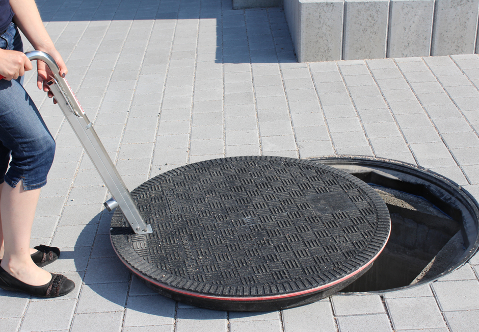 Das komfortable Ein- und Ausdeckeln ist ein großer Vorteil von GFK-Abdeckungen. So erleichtern sie den Zugang zu darunterliegender Infrastruktur, ohne Rückenprobleme zu verursachen. Sowohl die Standard- als auch die Reihenabdeckungen lassen sich durch den Einsatz von Bedienungsschlüsseln problemlos öffnen. Das Fußhebelwerkzeug FLA7 erleichtert das Vorgehen beim Ausdeckeln. Hiermit kann selbst eine Einzelperson die Abdeckung problemlos bewegen. Dabei wird der Schlüssel in die Aushebeöffnung gesteckt und eingehakt. Durch das Betätigen des Fußhebels klappt der Schachtdeckel nach oben und kann in die gewünschte Richtung gezogen werden.