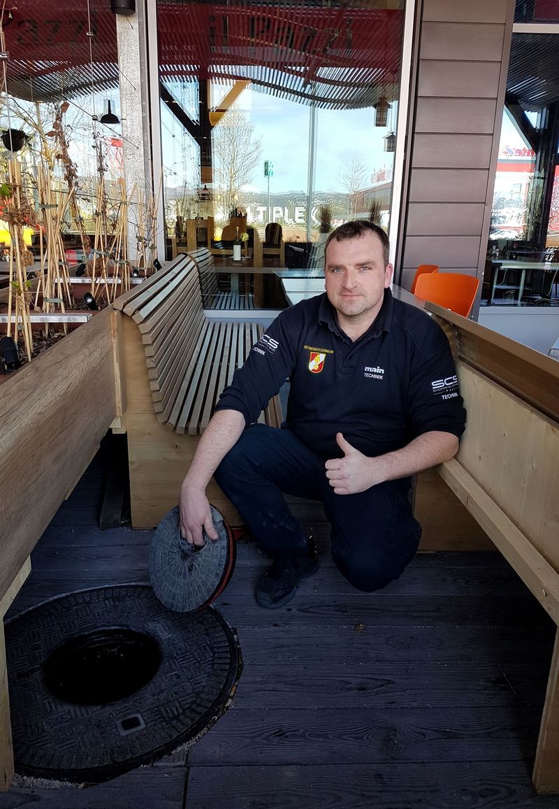 Dass die Gussabdeckung inmitten des Gastronomieabteils dafür verantwortlich war, fanden Markus Kavan – Mitarbeiter der Main Technische Dienstleistung GmbH und zuständig im Bereich Facility Management für die SCS – und Oliver Griess – Mitarbeiter der aqendo Österreich GmbH – mit Hilfe einer Vernebelungsmaschine heraus. „Wir konnten schnell erkennen, dass die Dichtung der Abdeckung zerquetscht war“, erklärt Kavan. Grund dafür sei das schwere Gewicht, das bei der monatlichen Entleerung durch Öffnen und Schließen des Deckels immer wieder auf die Dichtung im Rahmen eingewirkt habe. Um den Kunden wieder ein angenehmes Einkaufserlebnis zu bieten, wurde im Sommer 2017 die bestehende Schachtabdeckung durch eine Kunststoff-Abdeckung aus Faserverbundwerkstoff von KHK Kunststoffhandel aus Eggenstein ersetzt. „Das wichtigste Kriterium bei der Wahl war eine hundertprozentige Geruchsdichtheit“, so Kavan.