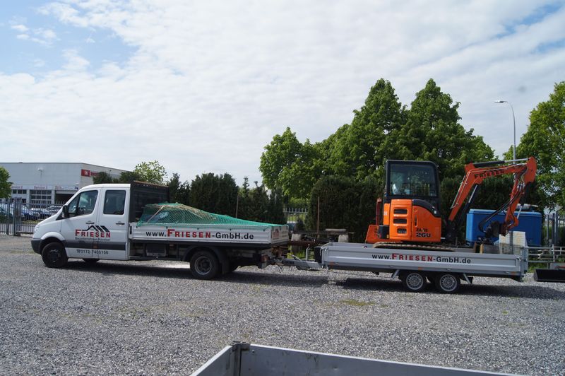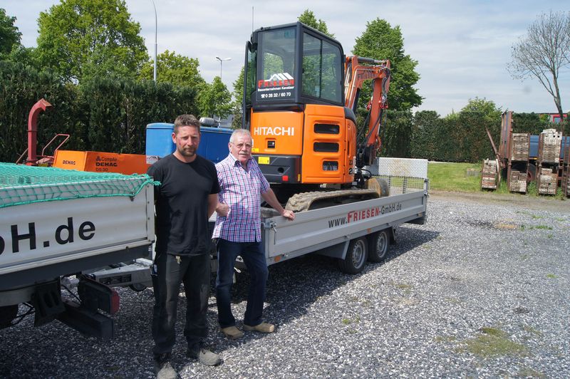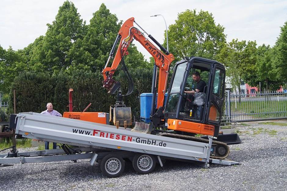 gebucht, abgeholt und wieder weggebracht werden mussten. Nun wird die Maschine in wenigen Minuten auf den Anhänger verladen und mit zur Baustelle genommen. „Wir haben nun die Möglichkeit, auch mal schnell einen Auftrag zusätzlich mit anzunehmen, was wir früher aufwendiger planen mussten“, erklärt Pierre Friesen. Und sein Vater Gerd fügt hinzu: „Dieser Bagger war wirklich ein guter Kauf und wird sich für uns schnell amortisieren.“