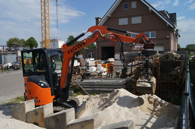 Eigentlich besteht der Maschinenpark der Friesen Hochbau & Plattierungs GmbH aus Kevelaer vor allem aus Hochbaukran, Autokran und Stapler. Das sind die klassischen Maschinen, die für die Erstellung von kompletten Rohbauten benötigt werden. Seit einigen Monaten hat Pierre Friesen auch einen Hitachi ZX26U-5 im Einsatz, der viele Arbeiten übernimmt, die früher manuell oder mit Hilfe von Mietmaschinen erledigt wurden.
