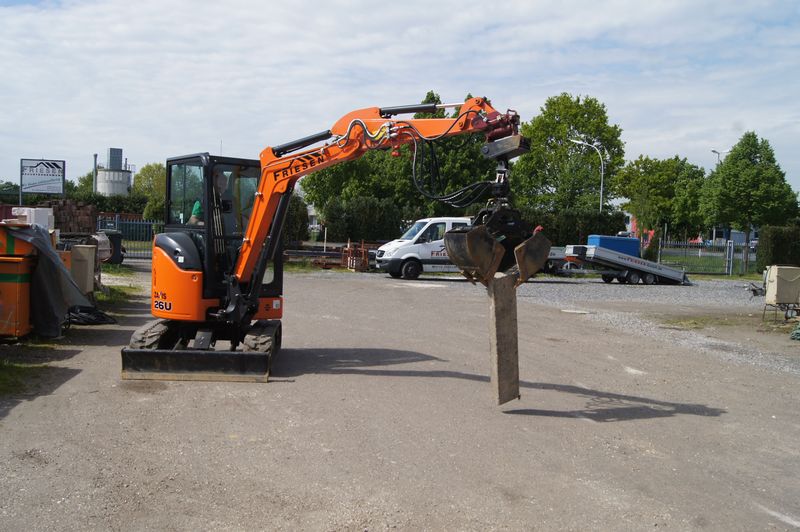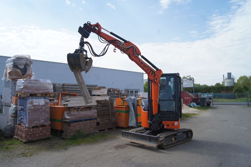 Durch die Anbaugeräte Zweischalengreifer und Räumlöffel sowie dem Powertilt, der Bewegungen des Anbaugeräts um 90 Grad in beide Richtungen ermöglicht, wird der Hitachi ZX26U-5 zum multifunktionalen Arbeitsgerät. Neben Erdbewegungsarbeiten und dem Ziehen von Planungen können mit dem Greifer auch L-Steine gehoben und platziert werden.