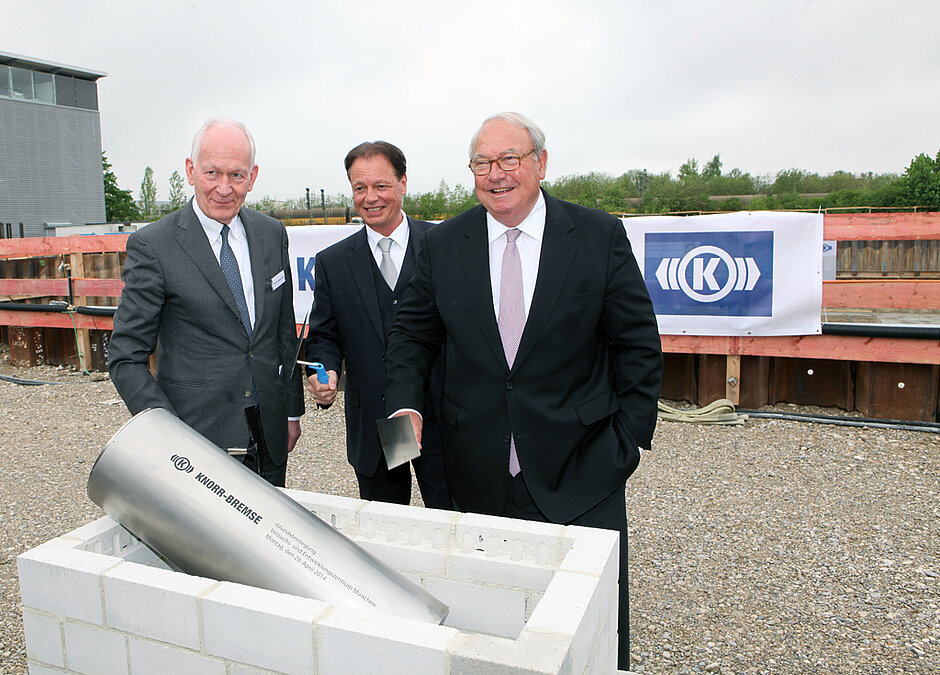 Knorr-Bremse baut am Firmenhauptsitz in München ein hochmodernes Versuchs- und Entwicklungszentrum mit rund hundert Prüfständen für Bremssysteme. Etwa 80 Mio. Euro investiert das Unternehmen in den Ausbau seiner Marktstellung als weltweiter Technologieführer von Bremssystemen für Schienen- und Nutzfahrzeuge. Zur feierlichen Grundsteinlegung am 28. April 2014 begrüßte Dr. Michael Buscher, Vorstandsvorsitzender der Knorr-Bremse AG, neben zahlreichen Gästen aus Politik und Vertretern der Münchener Stadtverwaltung den Eigentümer und Aufsichtsratsvorsitzenden der Knorr-Bremse Heinz Hermann Thiele.