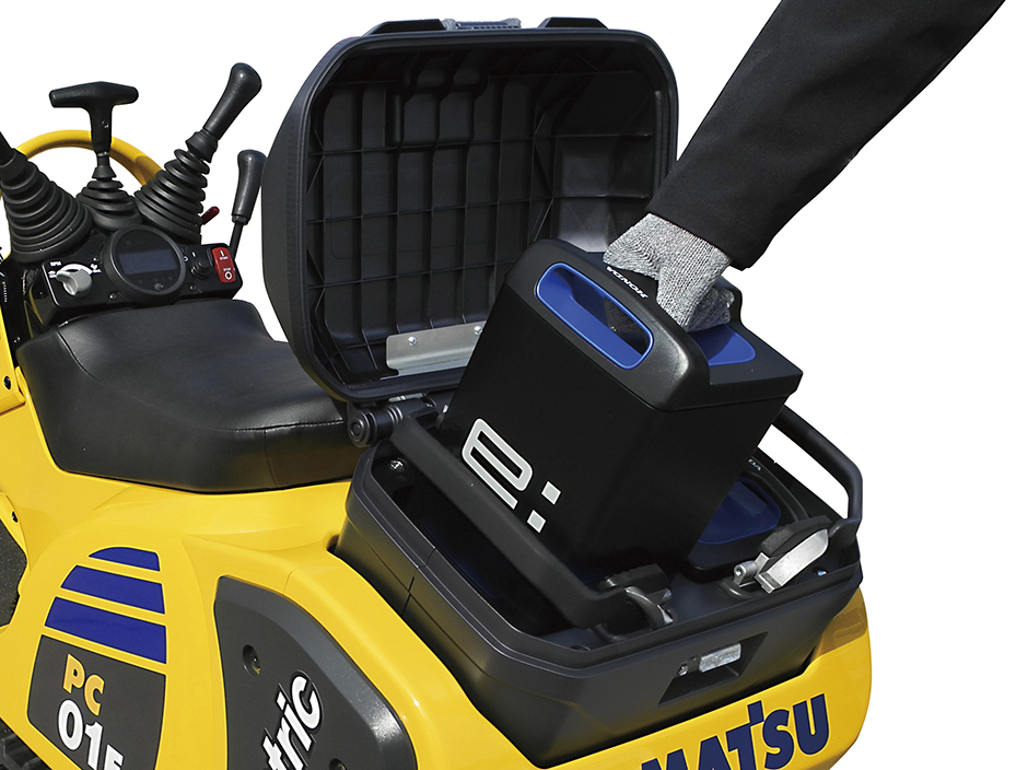 Durch die Elektrifizierung reduziert der PC01E-1 nicht nur den Geräuschpegel und die Abwärme, sondern ermöglicht auch umweltfreundliches, komfortables Arbeiten ohne Abgase – sowohl draußen als auch in Innenräumen. Für unterbrechungsfreien Maschinen-Betrieb können die Akkus einfach ausgetauscht werden. Da der neue elektrische Motor hohe Leistung auch bei niedrigen Drehzahlen liefert, ist mit dem PC01E-1 mehr Aushub möglich als beim Betrieb des konventionellen Modells bei niedrigen Drehzahlen. Des Weiteren bietet der PC01E-1 einen einfachen Austausch des Akkus und die Option, an 100-V-Hausanschlüssen geladen zu werden.