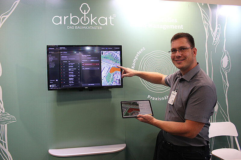 Doch nicht nur die Personal-, auch die Baumplanung kann digital leichter bewältigt werden, wie der Stand von Inovagis zeigt, die ihre Baumkatastersoftware Arbokat ausstellen. „Mittlerweile heißt sie Arbonet“, korrigiert Vertriebler Dirk Reinbold. Denn die Nordhessen haben ihr Produkt zu einem cloudbasierten Aboservice weiterentwickelt, das sich gerade in der Beta-Phase befindet und getestet wird. „Wir gehen davon aus, im November mit der App starten zu können“, verrät Reinbold. Eine Cloud-Lösung bringt im Vergleich zum Vorgängermodell den entscheidenden Vorteil einer einfacheren Zugänglichkeit für alle. Immerhin kann sie einfach aus dem Internet heruntergeladen werden. Über die App lassen sich Informationen zu den Bäumen im stadteigenen Kataster mit einer Vielzahl von Akteuren teilen, Fristen zur Bearbeitung anlegen und Mängel von jedem mit Fotos dokumentieren.