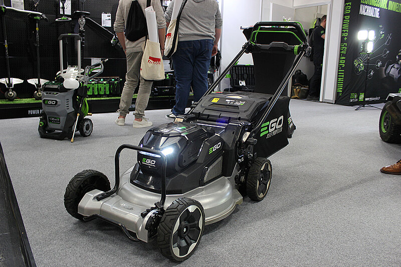 Auch GaLaBau-Experten werden auf der Messe fündig. Zum Beispiel beim Stand der EGO Europe GmbH. Die vorgestellten Produkte sind sogar so neu, dass die entsprechenden Flyer schon auf 2024 datiert sind. Besonders beeindruckend: der LMX5300-SP, der erste Profi-Kommunalmäher des Unternehmens. Dabei setzen die chinesischen Hersteller auf ein Aluguss-Mähdeck von dem sie sich eine hohe Robustheit und Stabilität versprechen. Um einen adäquaten Antrieb zu gewährleisten, kommt ein bürstenloser 1600-W-Motor zum Einsatz. Bei den Akkus findet sich ebenfalls eine Besonderheit: So verfügt der LMX5300-SP im Gegensatz zu einem gleich über zwei Akkuschächte. Mit der doppelten Kapazität soll die Maschine auch dann einsatzfähig sein, wenn kurzfristig hohe Leistungen zur Verfügung stehen müssen.