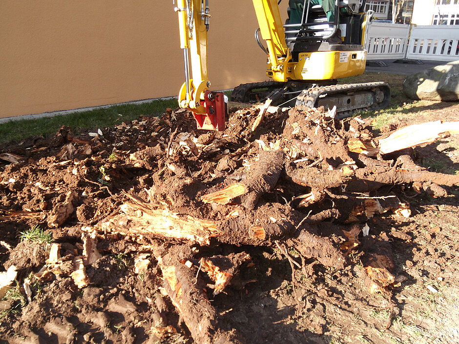 Um die Komplettrodung von Wurzelstöcken wirtschaftlich durchführen zu können, hat sich GaLaBauer Josef Vogl für seinen 1,6-Tonnen-Bagger das Anbaugerät Wurzelratte angeschafft. Damit konnte er den Aufwand auf etwa ein Fünftel reduzieren – verglichen mit vorher, als er die Wurzelstöcke am Stück ausgebaggert hat.