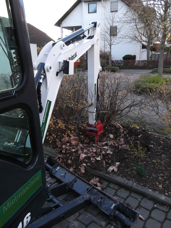 Bagger gibt es in vielen unterschiedlichen Gewichtsklassen. Aufgrund ihrer Kompaktheit haben sich im GaLaBau auch Minibagger unter zwei Tonnen etabliert. Josef Vogl aus dem oberbayerischen Weyarn, das an der A 8 zwischen München und Rosenheim liegt, hat sich für einen der leichtesten entschieden – er hat einen 1,6-Tonnen-Kettenbagger im Einsatz. Der Garten- und Landschaftsbauer arbeitet für umliegende Gemeinden und Stadtwerke, aber auch im Auftrag von Privatkunden. Mit einer Durchfahrtsbreite von unter einem Meter kommt er mit seinem Bagger ohne Weiteres auch durch enge Gartentörchen. Zudem ist der leichte, kompakte Bagger für ihn von Vorteil, weil Vogl ihn samt all seinen Anbaugeräten einfach mit dem Autoanhänger transportieren kann. Andererseits hat sich aber auch schon die Frage gestellt, ob ein Bagger dieser Größe bestimmten Aufgaben gewachsen ist: „Vor Kurzem musste ich in einem Garten einen Wurzelstock mit 80 Zentimeter Durchmesser roden. Es bestanden einige Zweifel, ob das mit der Wurzelratte an meinem Bagger zu schaffen sei, aber das war in einem Privatgarten und mit einem größeren Bagger wäre man da erst gar nicht hingekommen. Und dann ging das eben doch – und zwar wesentlich besser als gedacht“, erzählt Josef Vogl. „Natürlich muss die Hydraulikleistung des Baggers ausreichen. Das ist bei meinem 1,6-Tonner der Fall, der hat eine sehr gute Leistung. Und für die Wurzelratte ist im Grunde vollkommen egal, wie groß ein Wurzelstubben ist, entscheidend ist die richtige Technik: Ausschließlich durch die Bewegung des Löffelzylinders schabt man Stück um Stück ab.“ Das Baggeranbaugerät verfügt über eine horizontale und eine vertikale Schneide, mit denen der Wurzelstock zerkleinert und entlang seiner Wurzelanläufe aufgefasert wird.