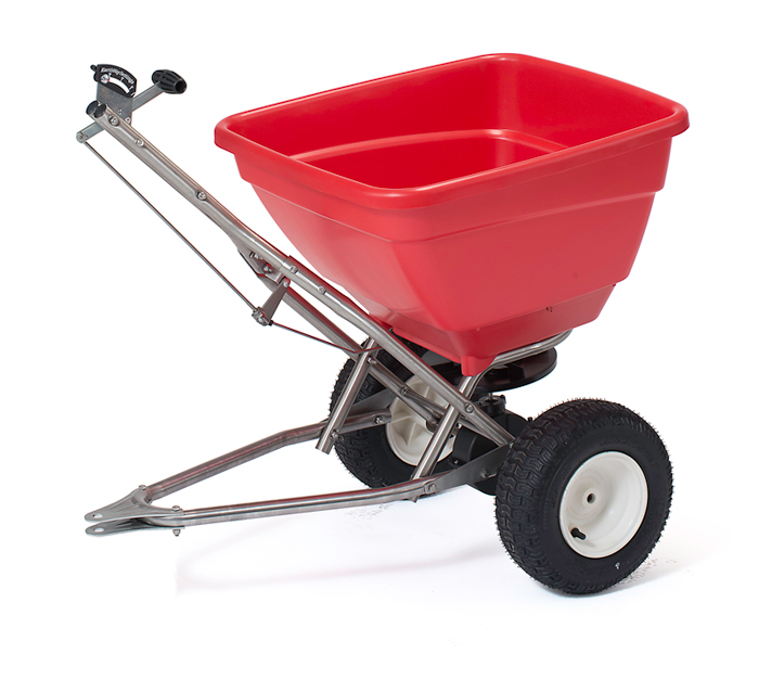 Mit einigen praktischen Details wird der Flex-Select-Streuer der namensgebenden Flexibilität durchaus gerecht. Der Streugutbehälter hat ein Volumen von wahlweise 40 oder 70 Litern. Mehr Volumen bedeutet vor allem bei größeren Flächen in der Praxis eine echte Zeitersparnis. Beim Fahrgestell kann man sich zwischen der Ausführung aus pulverbeschichtetem Stahl und der aus rostfestem Edelstahl entscheiden. Mit optional erhältlichem Zubehör kann man sein Gerät noch weiter auf individuelle Anforderungen anpassen. So wird zum Beispiel aus dem handgeführten Schleuderstreuer mit der Zugdeichsel ein Anhänge-Schleuderstreuer.